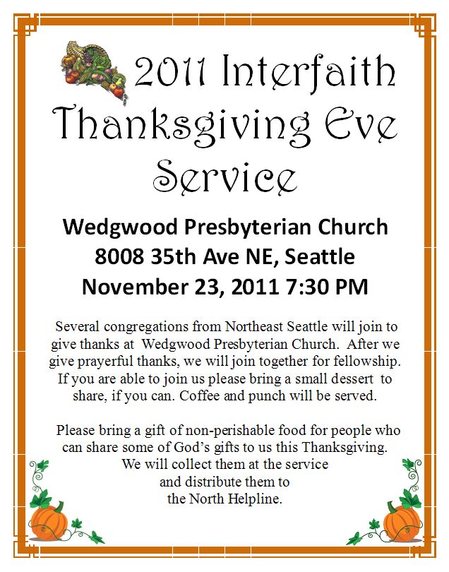 Several congregations from Northeast Seattle will join to give thanks at Wedgwood Presbyterian Church. After we give prayerful thanks, we will join together for fellowship. If you are able to join us please bring a small dessert to share, if you can. Coffee and punch will be served.