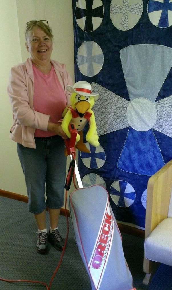 Godwin (our VBS mascot) is busy at church today. He's helping Vicki keep the church clean. Good job Godwin!