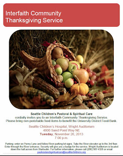 The pastoral care department at Children’s Hospital is hosting the interfaith service this year. Because of their schedule, the service will be held on Tuesday, November 26 at 7 PM. Click on the flyer for more information.