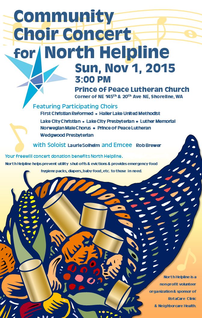 Wedgwood Presbyterian Choir is participating in the North Helpline Concert again this year. You are invited to join them on November 1, 2015, 3:00pm at Prince of Peace Lutheran Church. For more information please see the attached flyer.