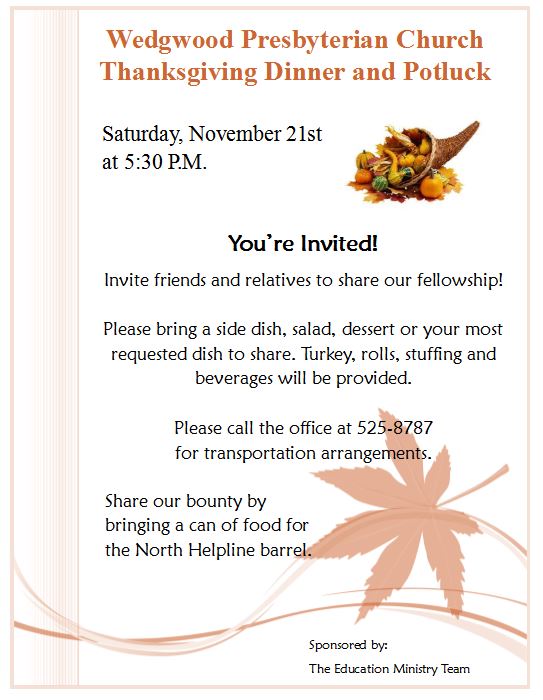 For our Thanksgiving Dinner and Potluck. Saturday, November 21st at 5:30pm. Invite your friends, family and neighbors!